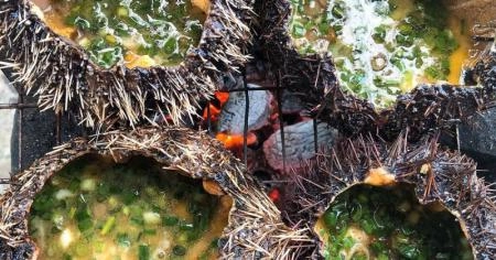 Nhum là loài giáp xác biển có thịt ngọt và giàu canxi. Nhum được nướng trên than hoa cho đến khi chín và héo lại, rồi rắc lên mỡ hành phi để gia tăng hương vị. Món nhum nướng mỡ hành có vị ngọt của nhum và cay của mỡ hành, là một món ăn bổ dưỡng và ngon miệng.