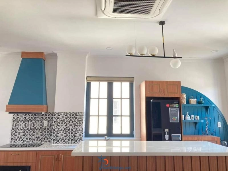 Khu vực bếp và bàn ăn được trang bị đầy đủ các thiết bị và dụng cụ nấu nướng hiện đại, từ bếp từ, lò vi sóng, tủ lạnh đến bộ đồ dùng bàn ăn cao cấp. Quầy bar phong cách trong khu bếp tạo ra không gian ẩm thực độc đáo, thích hợp cho các bữa tiệc vui vẻ.